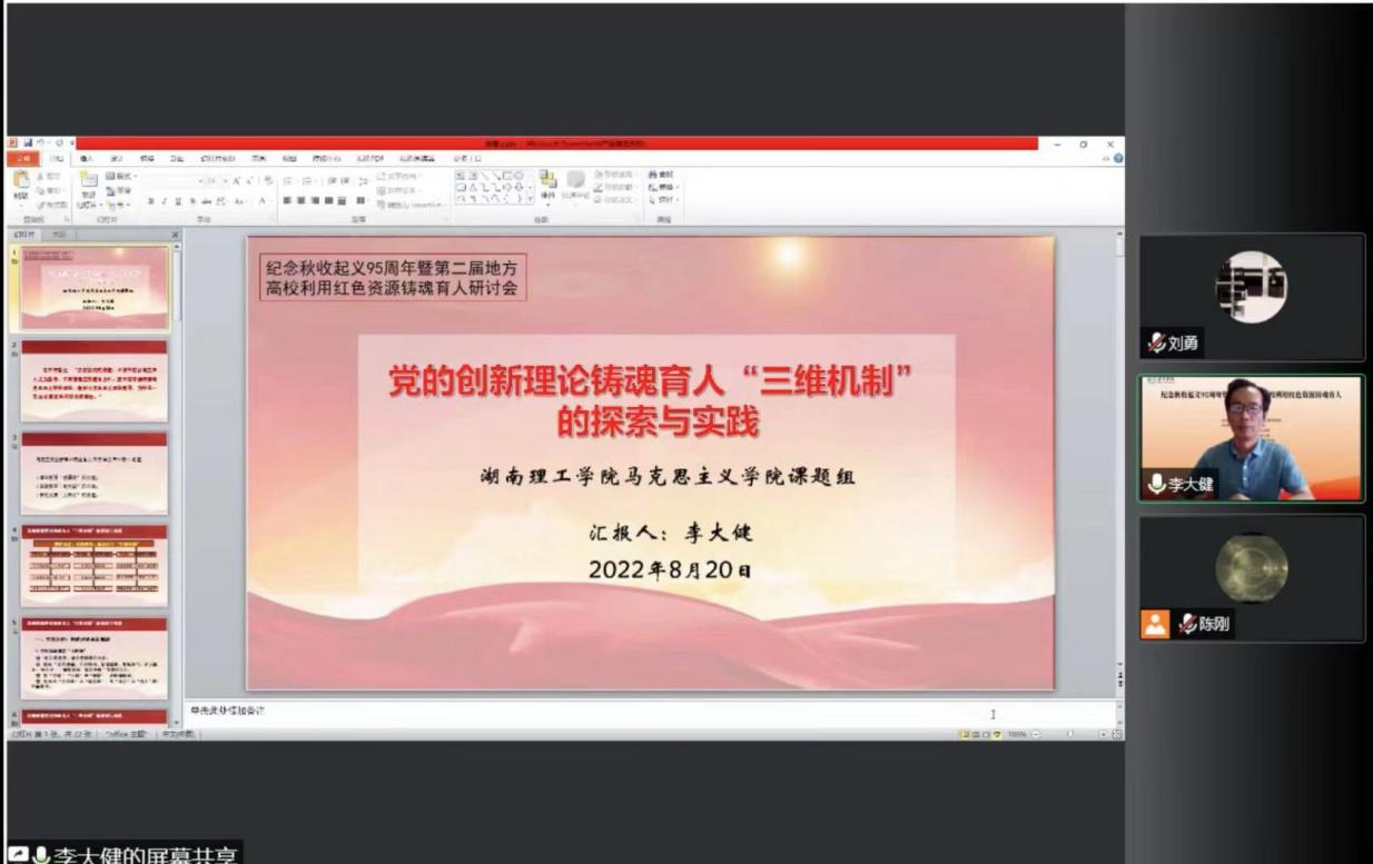 大会会期为一天,我校马克思主义学院全体老师通过线上方式参加会议,马克思主义学院院长鲁涛教授、李大健教授和期刊社社长彭柏林教授分别在大会上作主旨报告或典型发言,对我校长期探索形成的教学成果“党的创新理论铸魂育人的‘三维机制’”进行了宣传和推广,介绍了我校利用红色文化育人的有效经验和做法。