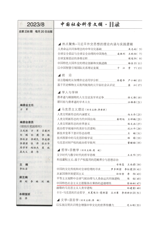 2020年以来,彭柏林教授先后在《北京大学学报(哲学社会科学版)》《道德与文明》《伦理学研究》等CSSCI来源期刊发表论文9篇,其中《光明日报(理论版)》论点摘编1篇、《中国社会科学文摘》全文转载3篇、人大复印资料全文转载5篇、《高等学校文科学术文摘》全文转载2篇。