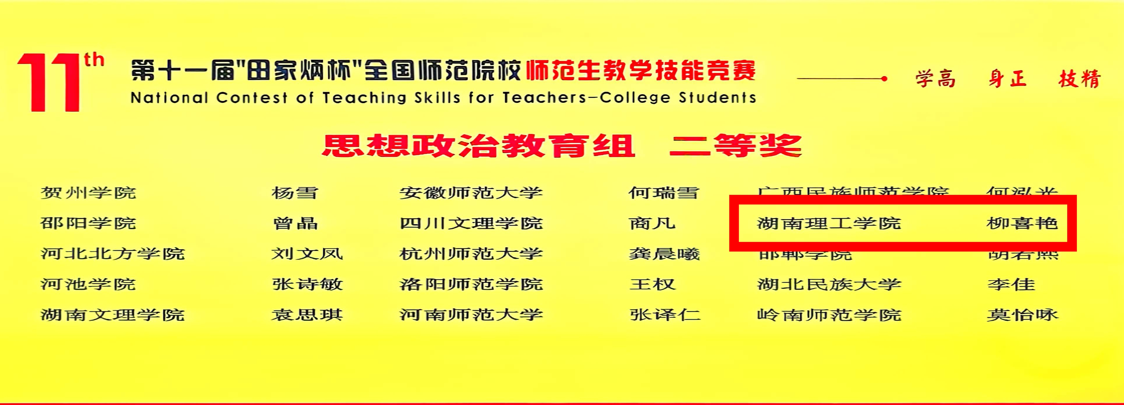 11月30日,第十一届“田家炳杯”全国师范院校师范生教学技能竞赛决赛在浙江师范大学落下帷幕。我院23级思政专业本科学生柳喜艳首次闯进决赛,并荣获全国二等奖。