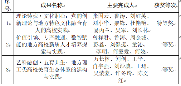 其中,《理论铸魂·文化润心:党的创新理论与地方特色文化融合育人的高校实践》荣获特等奖,《价值引领、专产融通、数智赋能的地方高校新质人才培养探索与实践》荣获一等奖,《艺科融创·五育共生:地方理工类高校美育生态体系的建构与实践》荣获二等奖。