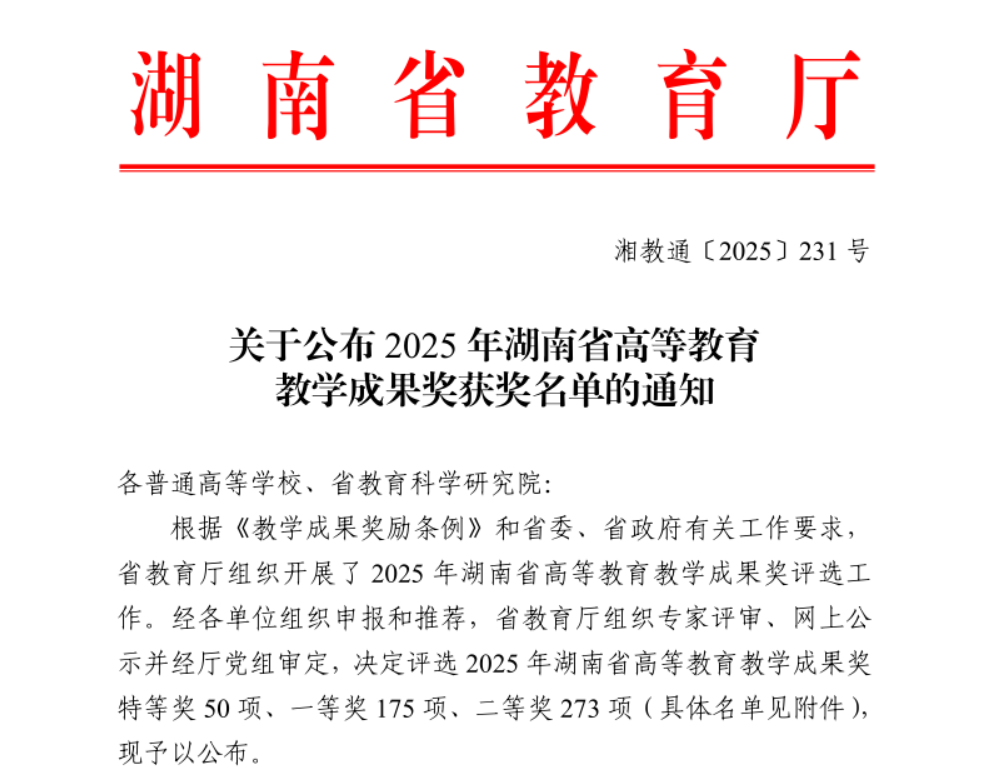 近日,省教育厅正式公布了2025年湖南省高等教育教学成果奖获奖名单,我院在学校党委、行政关怀和指导下喜获特等奖1项、一等奖1项、二等奖1项,创历史最好成绩。