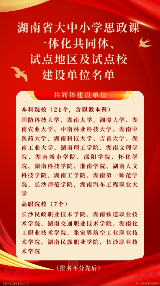 近日,湖南省大中小学思政课一体化共同体、试点地区及试点校建设单位名单正式公布,共遴选确定28个一体化共同体、5个试点市(州)、21个试点县(市、区)及100所试点校。由我校牵头,联合岳阳市教育体育局、岳阳市教科院、湖南石油化工职业技术学院、岳阳市一中等13家在岳单位申报的大中小学思政课一体化共同体成功入选。根据部署,我校将与各参与单位协同开展为期两年的系统性探索,计划至2027年底完成建设任务并接受验收。