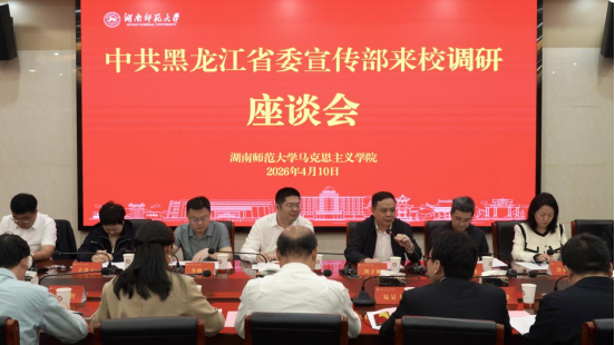 4月10日上午,黑龙江省委宣传部一行赴湖南师范大学开展“新时代学校思政课质量提升工程”专题调研座谈会。黑龙江省委宣传部理论处处长李庆海,湖南省委宣传部理论处处长刘子敏、二级调研员李晓勇,湖南省委教育工委宣传部副部长尹怡,以及湖南、黑龙江两省部分高校马克思主义学院负责人出席会议。我院院长鲁涛教授应邀参会,并作题为《立足本土特色资源,构建三课堂协同体系》的经验介绍。