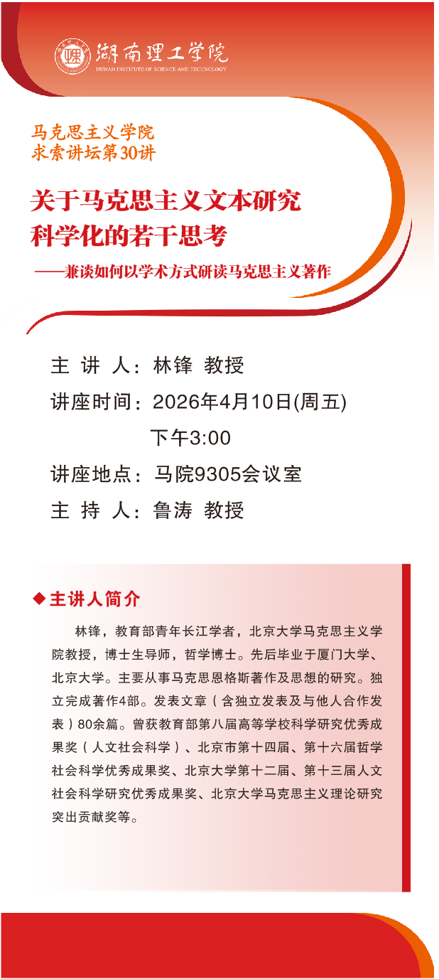 马克思主义学院求索讲坛第30讲预告:关于马克思主义文本研究科学化的若干思考--兼谈如何以学术方式研读马克思主义著作